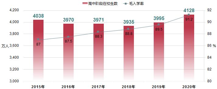 2020年,全國(guó)高中階段共有學(xué)校2.44萬(wàn)所。招生1504.00萬(wàn)人,在校生4127.80萬(wàn)人。高中階段毛入學(xué)率91.2%。