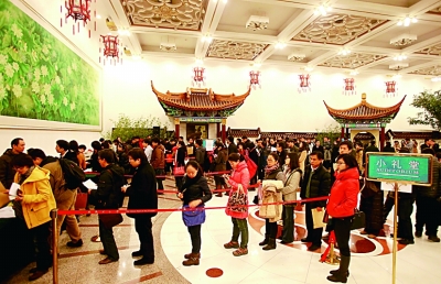 3月1日,大批參加十二屆全國人大一次會議采訪報道的記者聚集在人民大會堂澳門廳排隊等候領(lǐng)取證件。